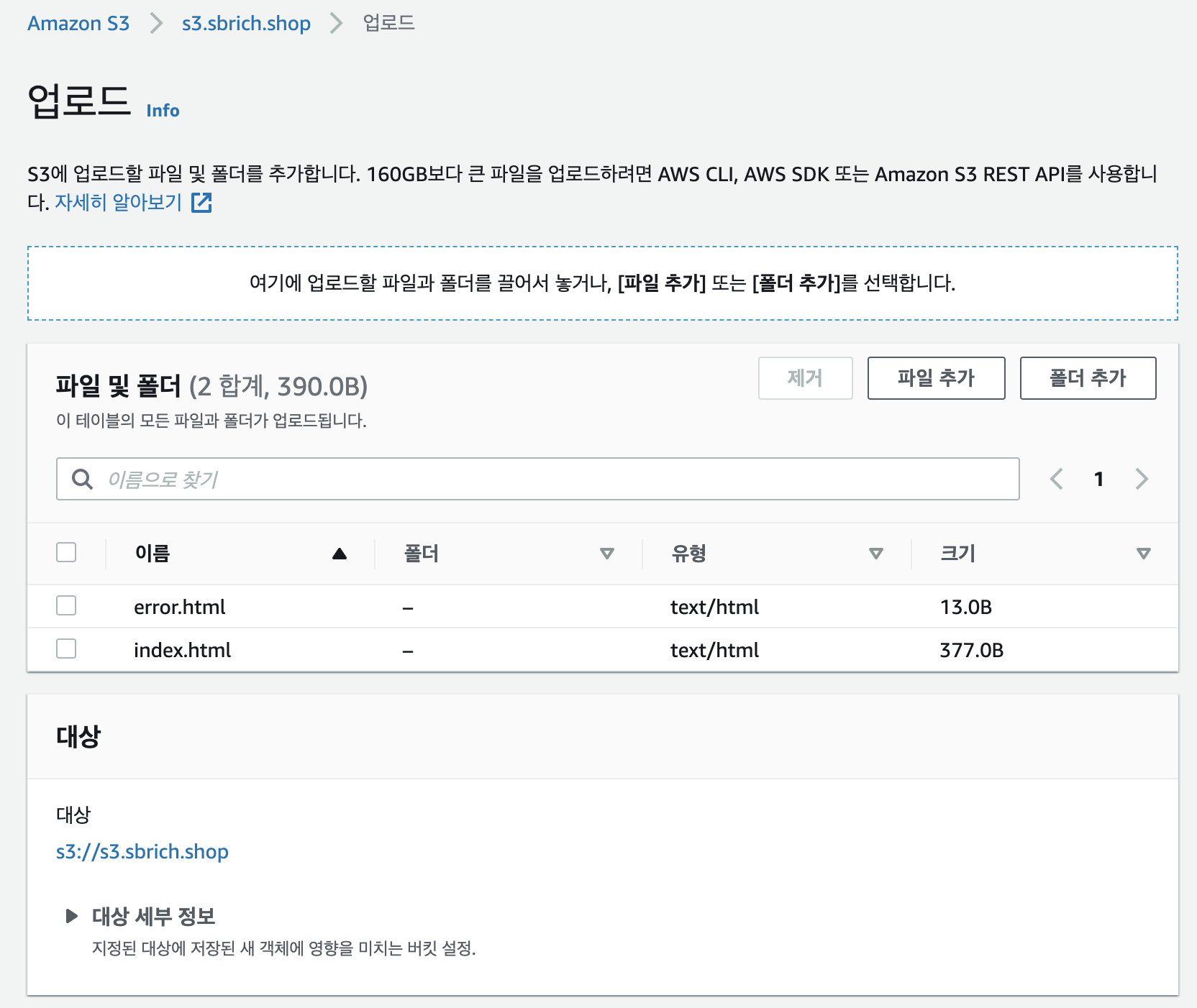 s3.sbrich.shop 경로에 index.html, error.html 파일을 업로드합니다.