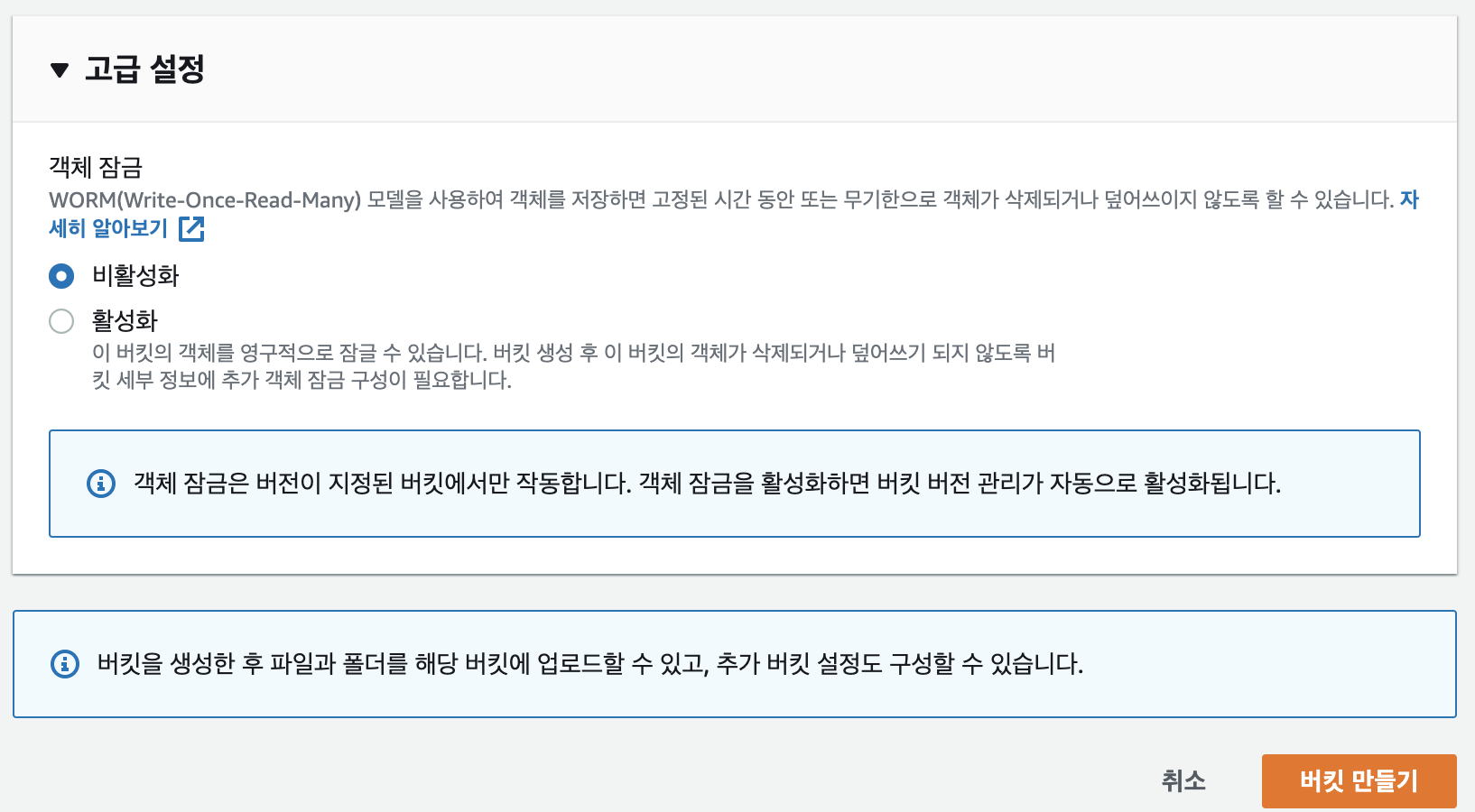 고급설정에서 객체잠금은 실습에서 '비활성'으로 합니다. 실습에서 '활성화'하여 사용하면 버전관리의 파일명에 버전이 붙는데 이를 사용하고 덮어쓰기 등의 기능을 사용하게 됩니다. 예를 들면, '삭제방지', '덮어쓰기방지' 옵션입니다. 이제 버킷 만들기를 클릭합니다.