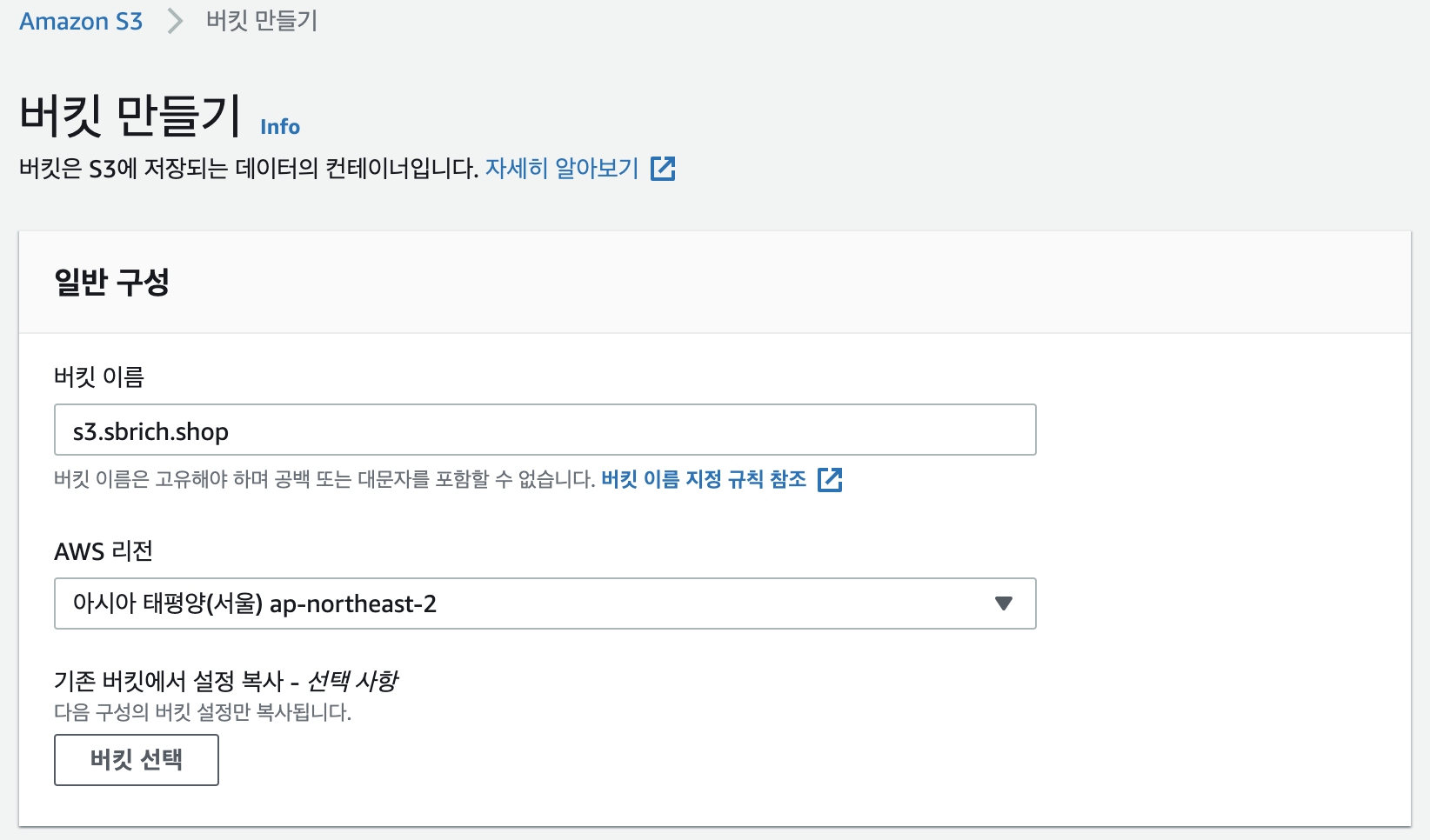 버킷이름은 's3.sbrich.shop', 리전은 '서울'로, 버킷은 기존버킷 설정복사 합니다.