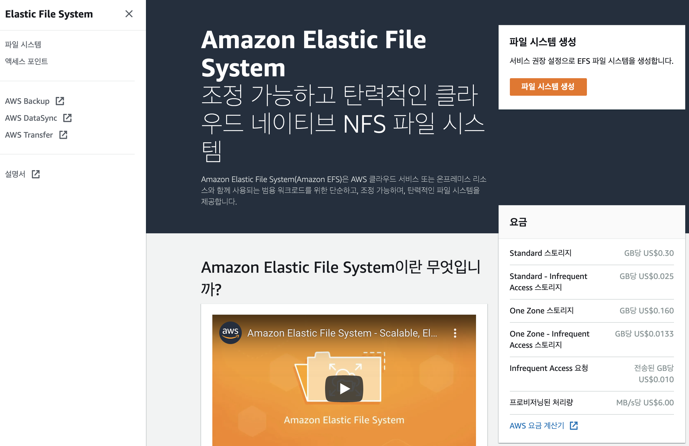EFS 메뉴로 이동합니다. 파일 시스템 생성 버튼을 클릭하여 생성 과정을 진행합니다.