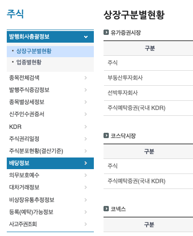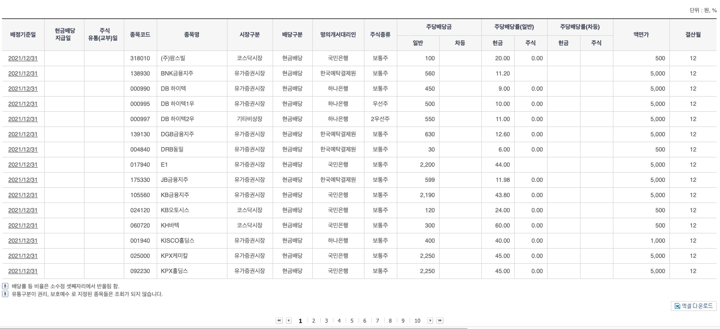 검색결과가 워낙 많이 출력됩니다. 따라서 필요시에는 원하는 기업명으로 하는 방법이 좋습니다. 우선은 종목명으로 오름차순으로 출력이 됩니다. 아직 3월 초순경이라 현금배당지급일이나 주식유통일이 지정된 업체가 없습니다.