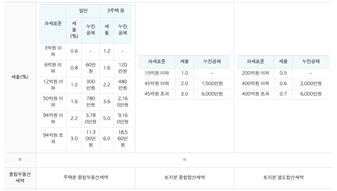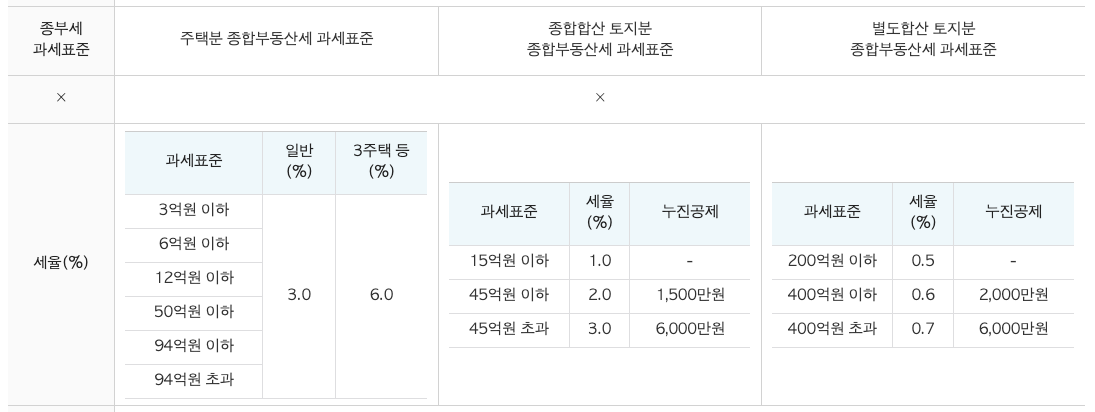 - 과세기준일 (매년 6월 1일) 현재 국내에 소재한 재산세 과세대상인 주택 및 토지를 유형별로 구분하여 인별로 합산한 결과, 그 공시가격 합계액이 각 유형별로 공제금액을 초과하는 경우 그 초과분에 대하여 과세되는 세금입니다.