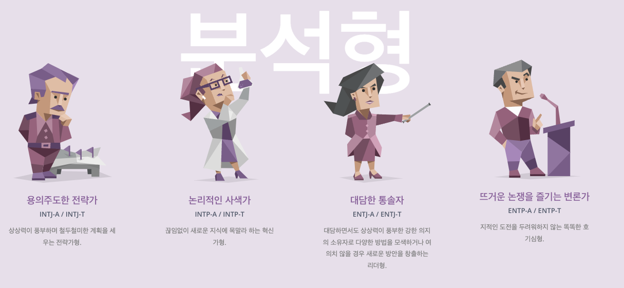 심리테스트라기 보다는 성격유형, 성향에 관한 특성을 16가지로 나누어 분류하는 검사이니 참고하는 용도이죠.