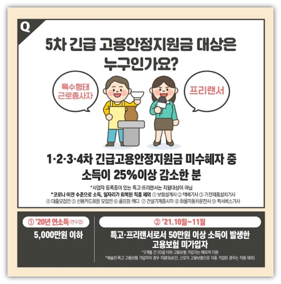 • 2021년 10월 ~ 11월 중 이번 5차 긴급고용 안전지원금에서 지원하지 않은 직종에 종사하지 않은 고용보험(근로자) 미가입자를 대상으로 함