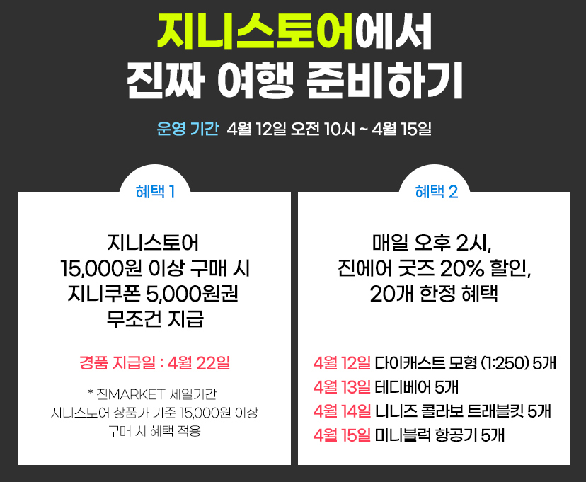 지니스토어에서 최소결제 15,000원 이상 구매 시 지니쿠폰 5,000원 지급하며 매일 오후 2시, 진에어 굿즈 20% 할인, 20개 한정 혜택이 주어집니다.