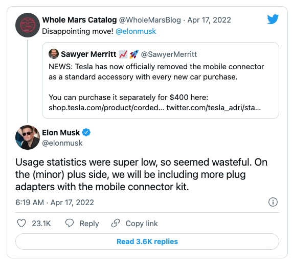 놀라운 변화로, 테슬라는 그것의 차량에 충전 장비를 포함시키던 오랜 관행을 갑자기 중단했다. 일론 머스크 테슬라 최고경영자(CEO)는 트위터에서 새 정책에 대한 언급에 대해 "사용량 통계가 매우 낮아서 낭비적으로 보였다"고 답했다.