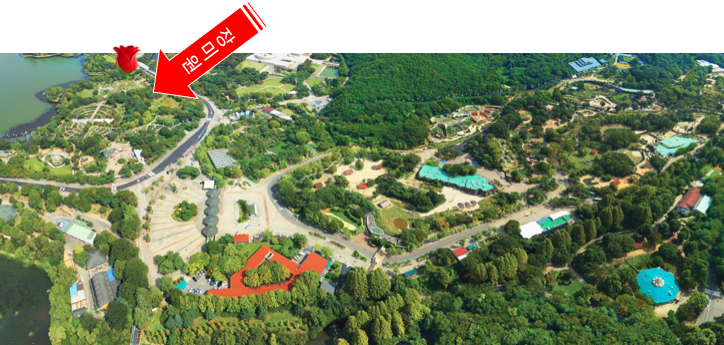 요기, 화살표가 서울대공원 장미원입니다.