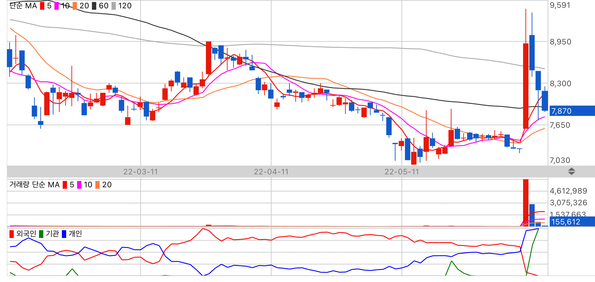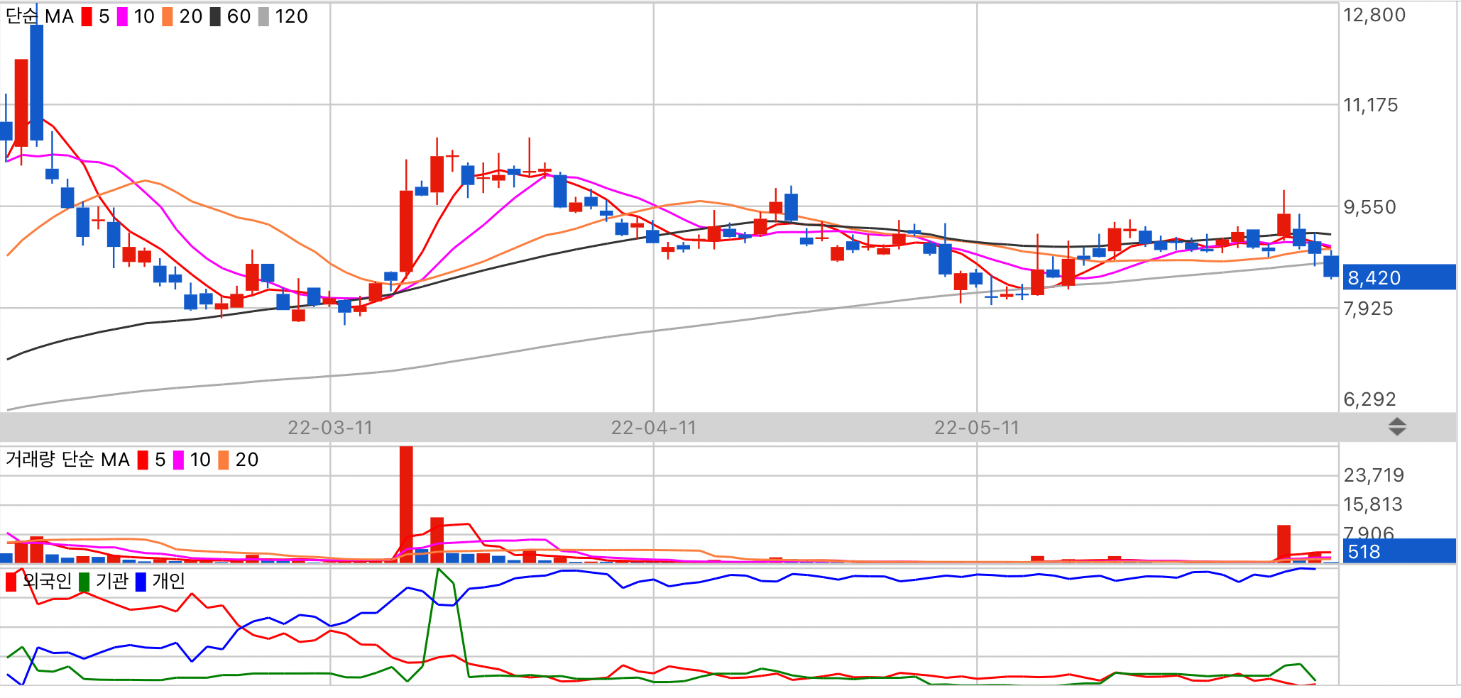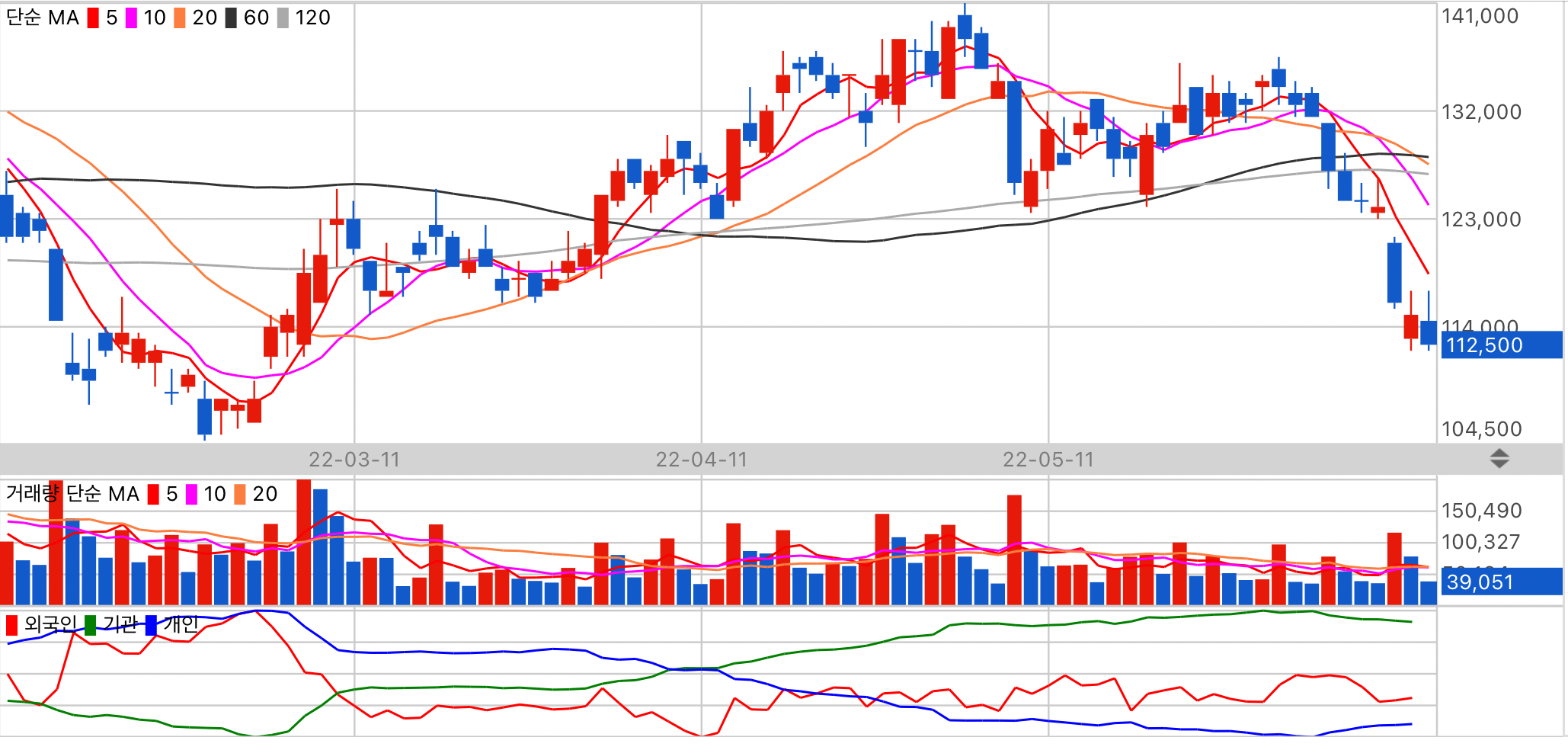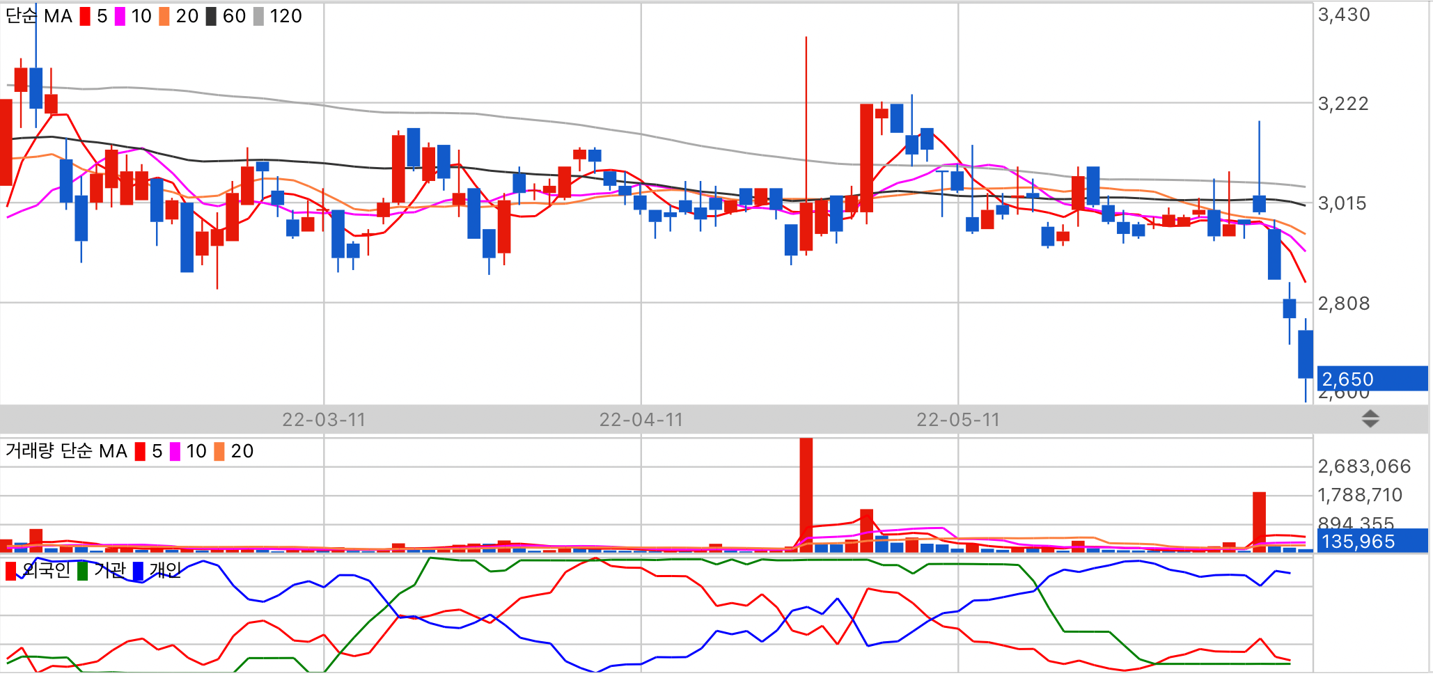 FOMC 자이언트 스텝 불안감으로 지수 급락할 때 같이 급락했습니다. 기관, 외인의 지분은 큰 변화가 없습니다. 저가매수 기회일까요?