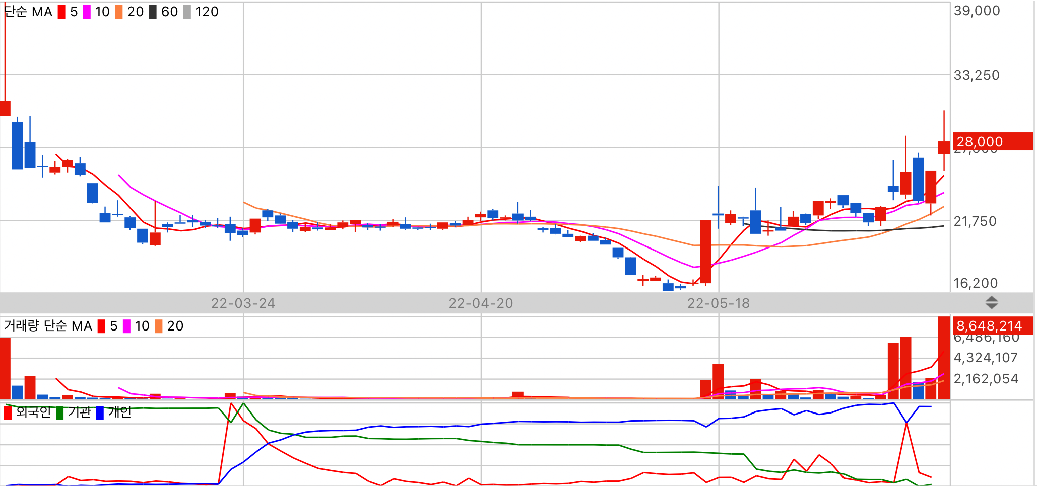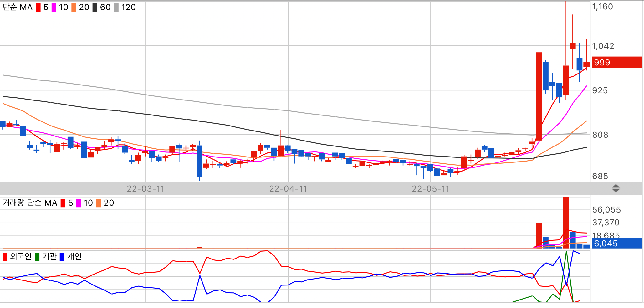 자율주행 테마주로 급등했다가 급락했습니다. 개인의 잔량이 남아있는 상태입니다.