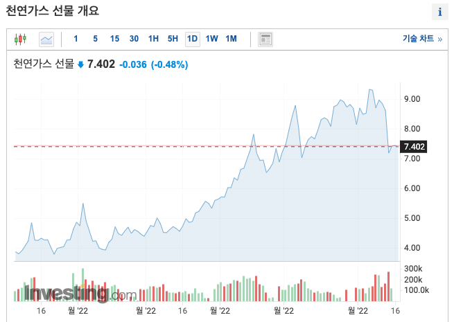 러시아의 유럽 제재나 가스의 공급과 수요에 따라 변동이 크게 나타나고 있습니다.