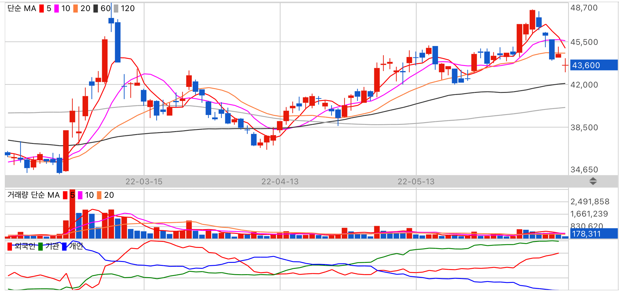저평가 종목이지만 수급이 저조합니다. 상대적으로 기관 수급이 높습니다.