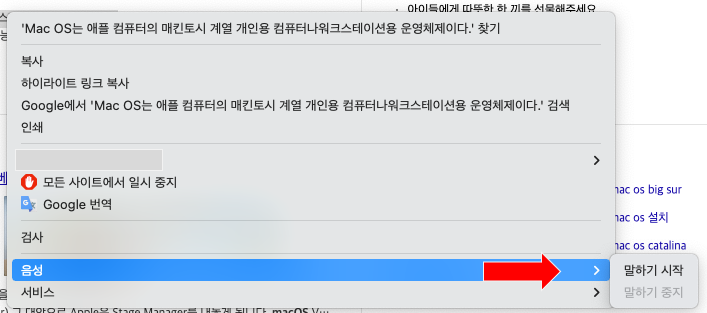 2) 마우스 우측버튼이나 상단 메뉴(수정)의 팝업에서 '음성 > 말하기 시작' 클릭