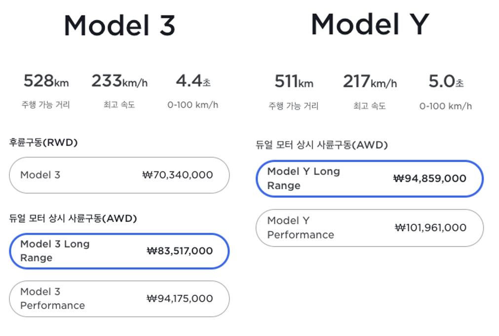 모델3는 거의 1억, 모델Y는 1억이나 다름이 없네요.
