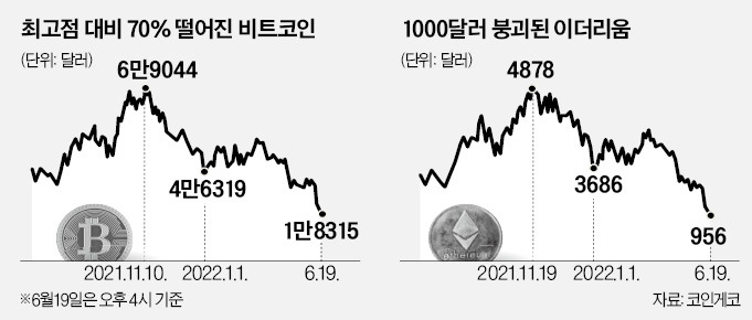 "날개잃은 암호화폐" 비트코인 붕괴에 줄줄이 급락