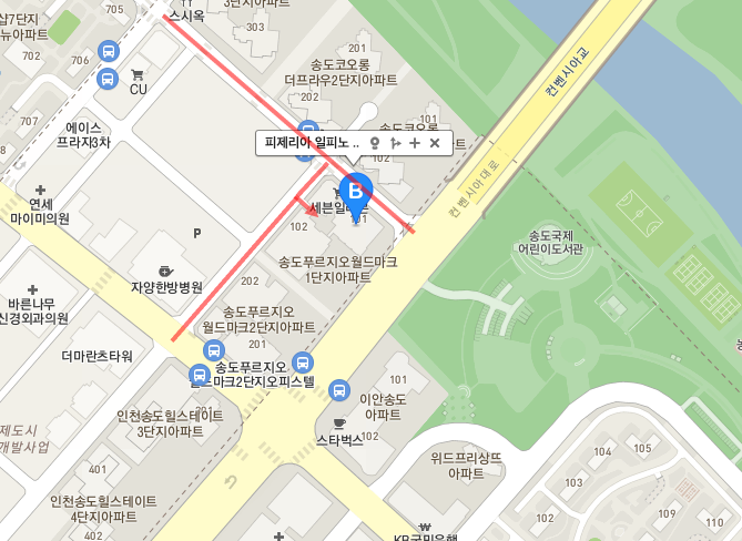 내비 '피제리아 일피노 월드마크점' 주소 '인천광역시 연수구 컨벤시아대로 50' (송도 푸르지오월드마크 1단지 101동2층 205호)