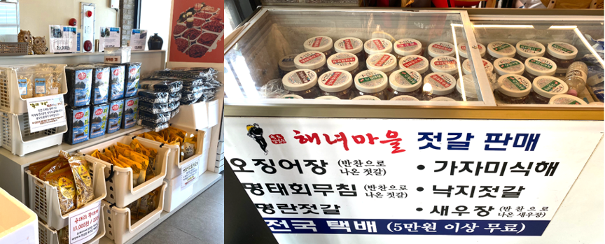 카운터옆을 보시면 해녀마을에서 속초 특산물 및 직접 만든 상품 '젓갈', '식혜', 각종 젓갈도 판매하고 있습니다.