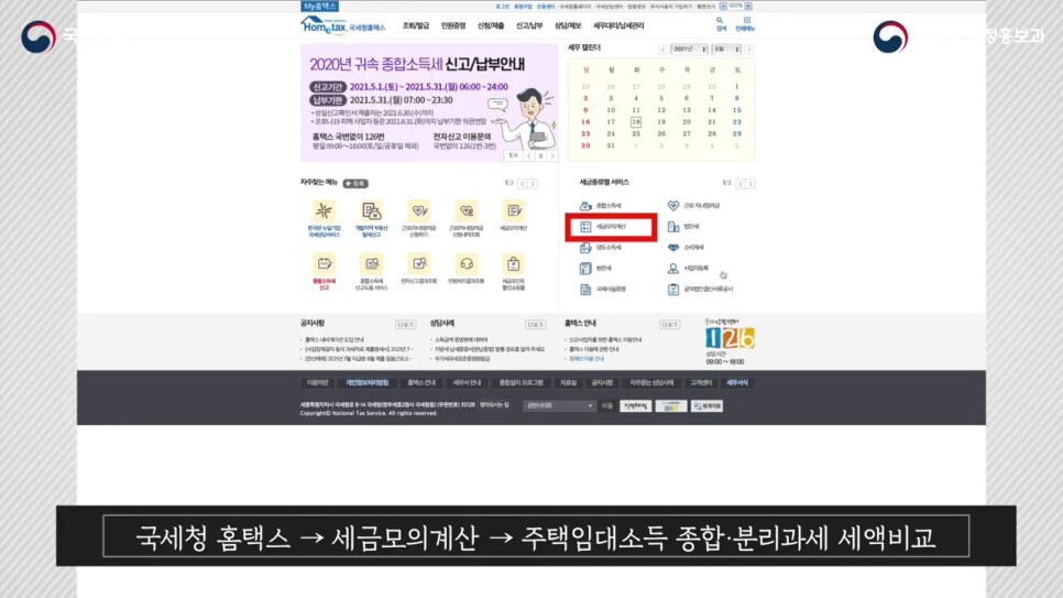 간주임대료 계산이 복잡하고 어려울 경우, 국세청 홈텍스에서 세금모의계산 서비스를 이용하면 됩니다.
