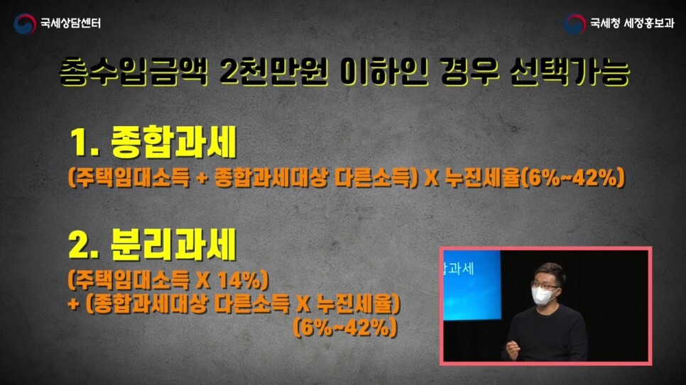 분리과세로 과세가 되는 상황은 총수입금액이 2천만원 이하인 경우, 유리한 방법 한가지를 선택해서 신고하는 것이 가능합니다. 하지만 2천만원이 넘으면 무조건 종합과세에 해당합니다.