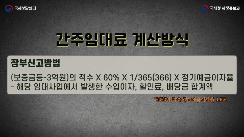 이 두 가지 방법에 따라 간주임대료 계산방법이 달라집니다.
