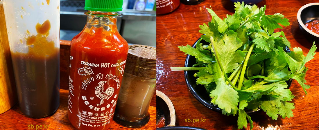 먹다가 신선한 고수도 추가로 먹었습니다. 얼큰이 아닐 때에는 스리랏차 소스도 넣어서 먹어봤습니다. 매콤함이 가미됩니다. ^^