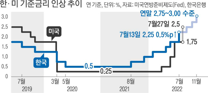 한국은행 사상 첫 빅스텝에 따라 기준금리는 1.75%에서 2.25%로 0.5%포인트 인상하였습니다.