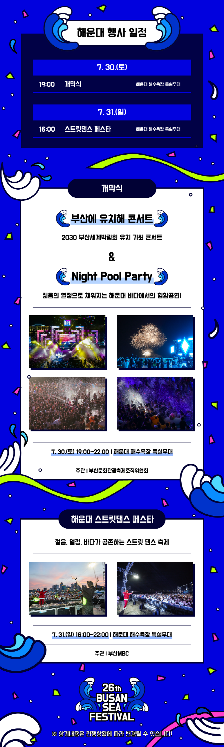 축제는 각 해수욕장의 색깔을 담은 다양한 프로그램으로 사람들을 맞이하는데 축제의 시작을 여는 것은 해운대에서 펼쳐지는 개막파티입니다. 매해 새로운 모습을 추구하며 대규모 살수시설 및 버블폼, 인공 풀장을 활용한 '풀파티' 컨셉의 올 스탠딩 참여 공연으로 시작합니다.