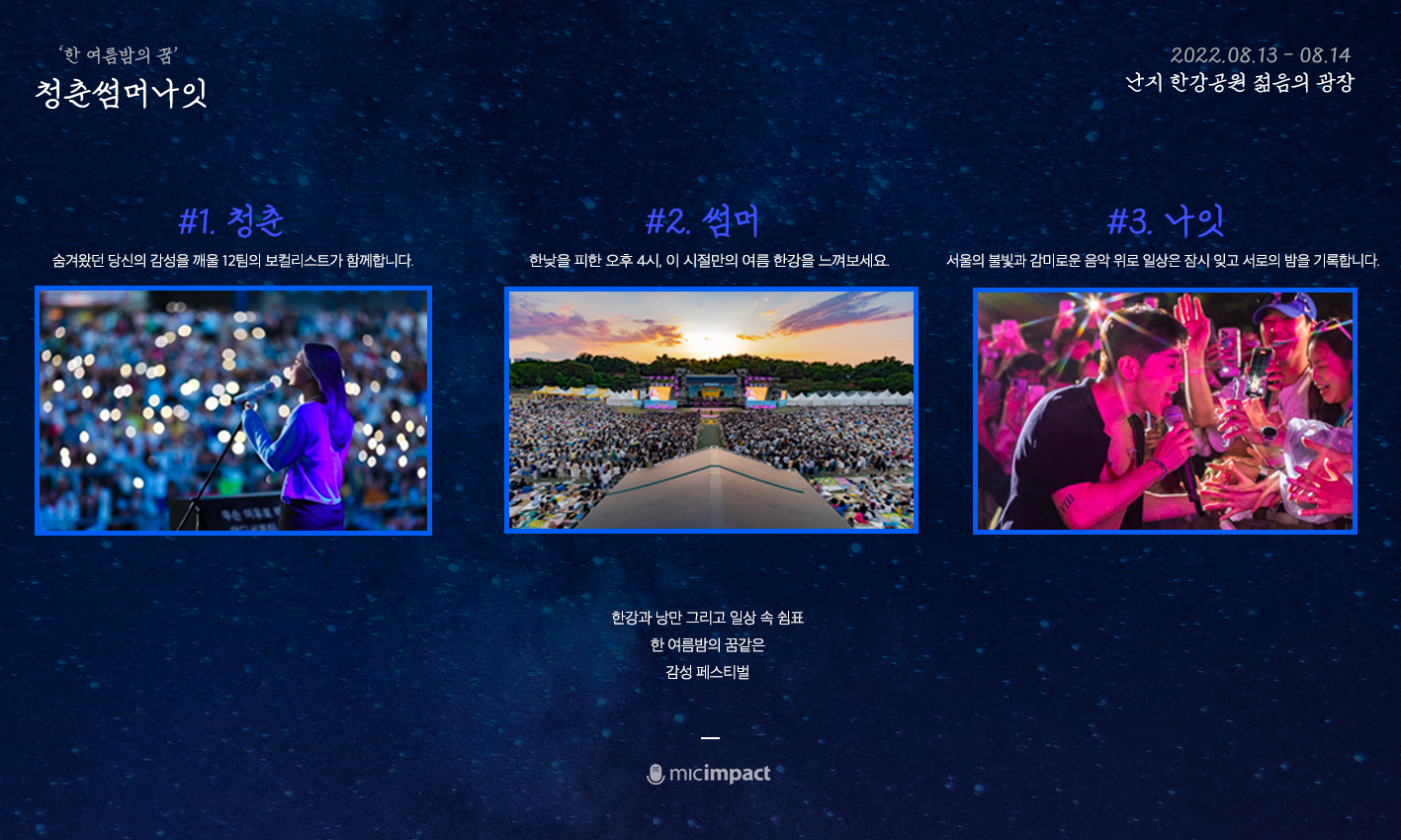 | - 일시 : 8. 13.(토)~8. 14.(일) 16:00~22:00 - 장소 : 난지한강공원 젊음의 광장 - 주최 : 마이크임팩트 / 주식회사D&Y - 문의 : 홈페이지 참고 - 안내 페이지 : 바로가기 |