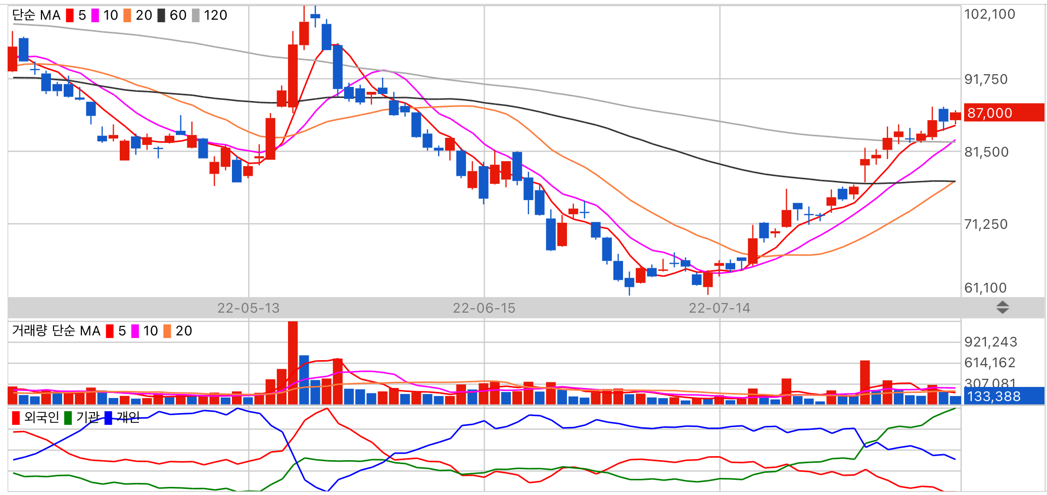 현재 가치는 높은고평가이며 업종모멘텀은 우수합니다. 수급 주체 외국인의 동향을 주시해 주세요.