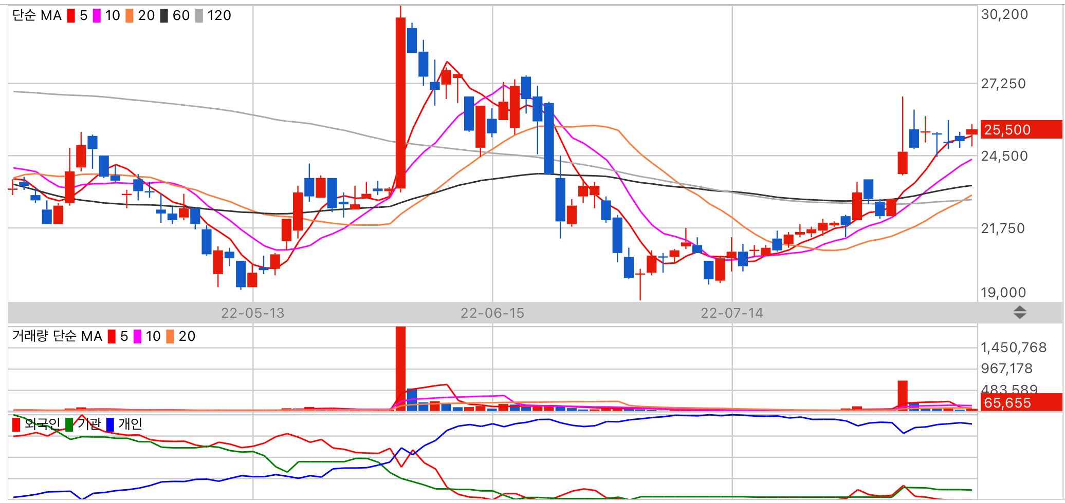 현재 가치는 높은고평가이며 업종모멘텀은 우수합니다. 수급 주체 외국인의 동향을 주시해 주세요.