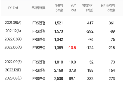 2021년 연결 기준 매출액 1854억9867만원, 영업이익 404억 5798만원. 전년비 매출액 65.8% 상승, 영업익 314.5% 증가.