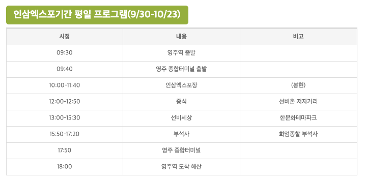 예약신청/확인 및 상세 정보는 영주시티투어 사이트에서 하시기 바랍니다.