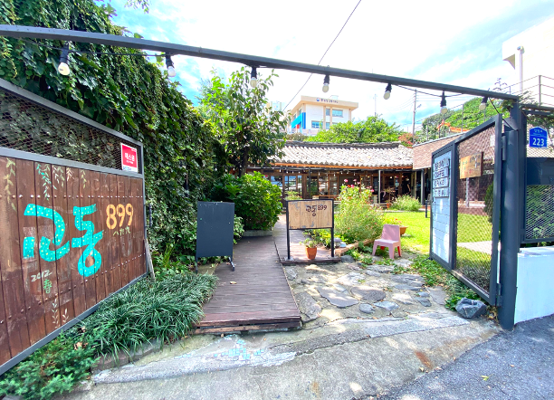 교동899는 한옥카페로 한옥과 모던한 간판이 있는 옆면, 작은 정원이 있는 앞 마당과 길가측 야외테이블까지.