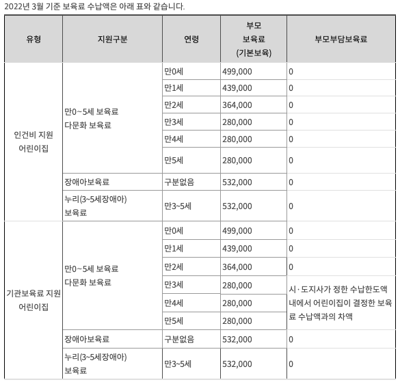 ※ 기관보육료 지원 어린이집 유아반(만3세 이상) 아동은 시·도지사가 정한 수납한도내에서 해당 어린이집 보육료 수납액과 부모보육료의 차액만큼을 부모가 부담. 단, 영아(만0~2세아)는 차액부담이 없으며, 유아(만3세 이상)의 경우라도 법정저소득층과 장애아동은 부모부담 없음.