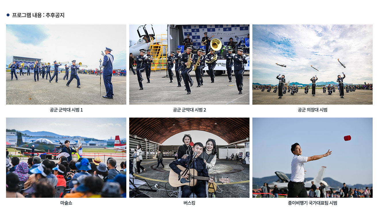 개막식, 공군 음악연주회, 에어쇼, 항공인의 밤, 학술회의, 홍보관, 항공우주 관련 체험 및 교육, 항공 청소년의 날 등