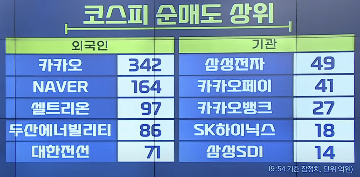 외국인은 카카오(342억), NAVER(164억), 셀트리온(97억), 두산에너빌리티(86억), 대한전설(71억) 순매도 중이고