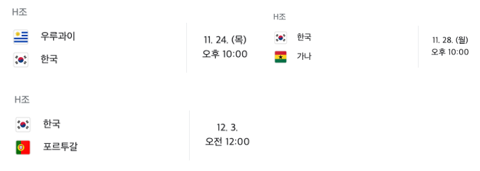 더불어 카타르 월드컵 H조 대한민국팀 주요일정입니다. 카타르 월드컵 개막식은 20일이고 한국경기 당일 주가가 올라갈 가능성이 높습니다.