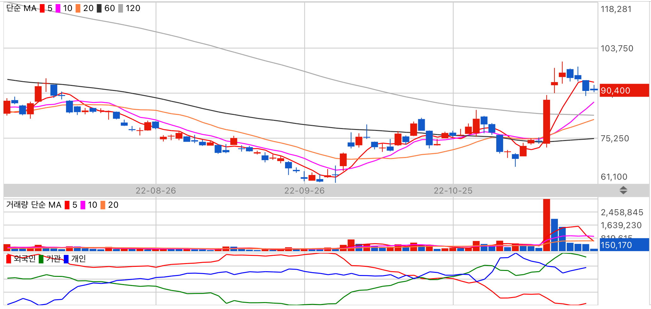 현재 가치는 고평가이며 업종모멘텀은 우수합니다. 수급 주체 기관의 동향을 주시해 주세요.