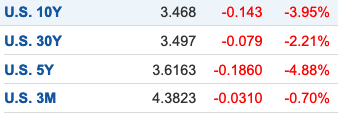 금리 선물 시장에서는 연준의 공격적인 금리 인상 전망도 빠르게 후퇴하며, 기준금리가 내년 4.75~5.00%로 정점을 이룰 것이란 전망이 대세를 이루고 있습니다. CPI 발표 전에는 최종 금리가 5.00~5.25%에 이를 것이란 전망이 우세했었습니다.