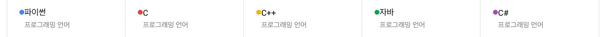 먼저 1위~5위 Python(파이썬 언어), C(C 언어), Java(자바 언어), C++(Cpp 언어), C#(C sharp 언어) 입니다.