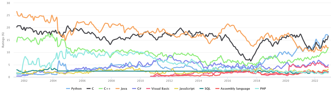 TIOBE 프로그래밍 커뮤니티 지수는 프로그래밍 언어의 인기를 나타내는 지표이다. 인덱스는 한 달에 한 번 업데이트됩니다. 등급은 전 세계의 숙련된 기술자 수, 과정 및 타사 공급업체를 기준으로 합니다. 구글, 빙, 야후!, 위키피디아, 아마존, 유튜브, 바이두와 같은 인기 있는 검색 엔진이 등급을 계산하는 데 사용된다. TIOBE 인덱스는 최상의 프로그래밍 언어 또는 대부분의 코드 행이 작성된 언어에 관한 것이 아닙니다.