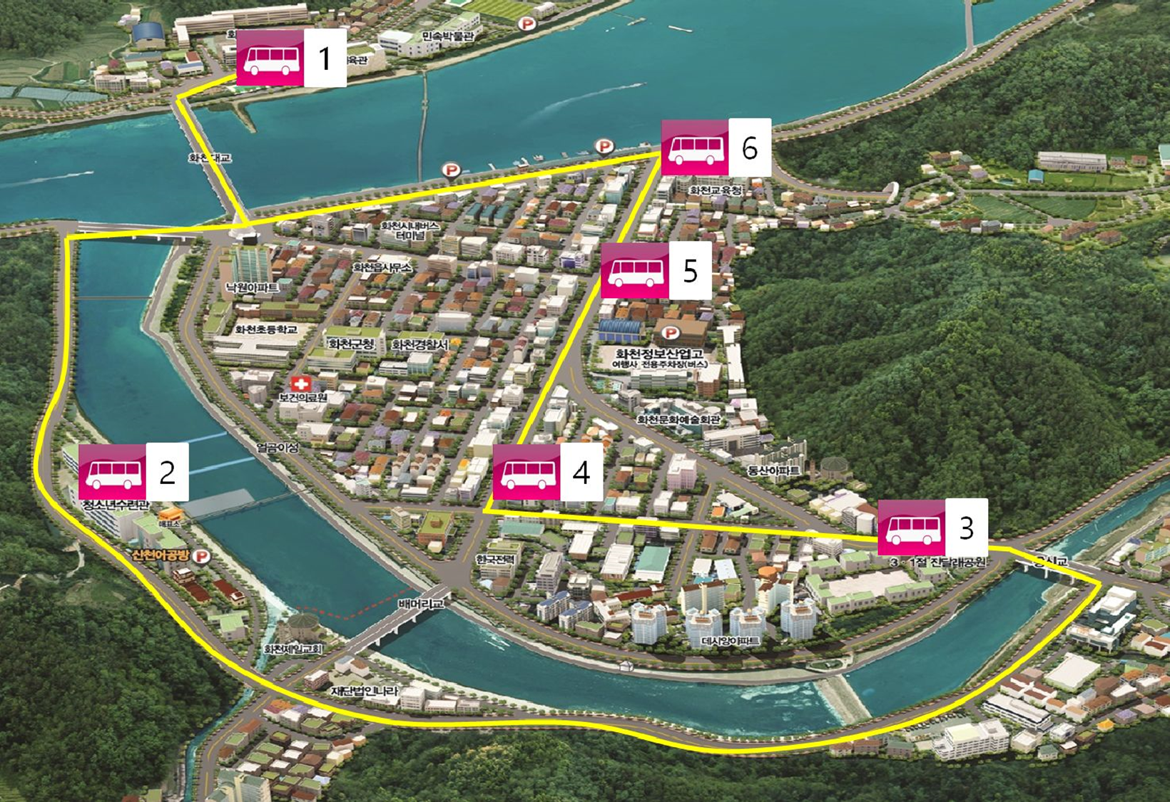 1.화천체육관 ⇨ 2.화천군청소년수련관 ⇨ 3.헌병대 앞 ⇨ 4.구이구이 앞 ⇨ 5.화천정보산업고등학교 ⇨ 6.화천교육지원청(배수펌프장) ⇨ 1.화천체육관