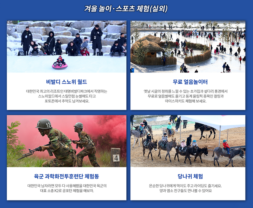 비발디파크 스노우 월드(눈썰매), 스피드 스택스 공연 및 체험, 서바이벌체험, K2소총 공포탄 체험, 무료민속 놀이터(얼음썰매, 얼음축구 등), 홍천군 홍보관, 시골 초가집 풍경 재현, 당나귀타기 체험, 실내체험관, 동물체험장, 향토음식점, 실외 먹거리터, 선등거리, 얼음 눈꽃 분수 등