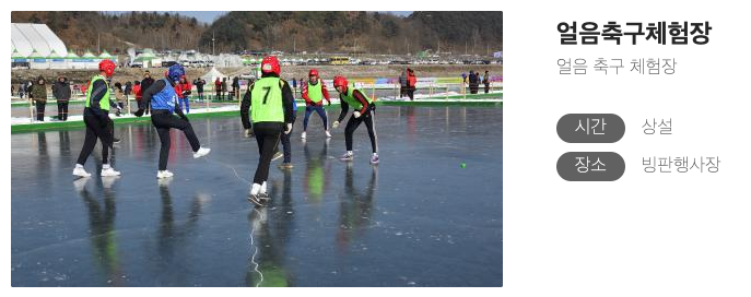 - 빙어낚시, 얼음축구, 윈터서든어택, 산촌마을(스노우 빌리지), 눈썰매장 등