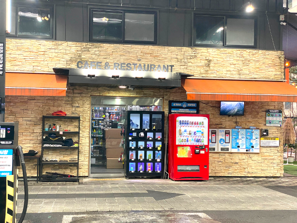 좀 더 뒤에서 보면 오른쪽 입구이고 정면은 카운터, 자판기 옆에 멤버십카드 발급 및 충전기가 있다.