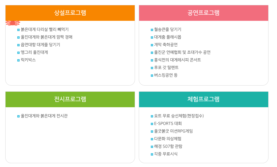 그러면, 울진대게와 붉은대게축제의 자세한 행사와 프로그램, 체험행사에 대해서 알아볼까요.