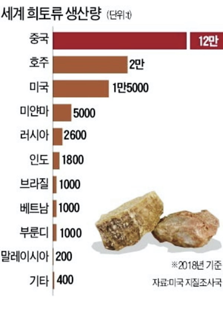 세계 시장에서 중국의 영향력에서 희토류는 매장량 37%, 광물 생산량 60%, 제련 및 자재 공급량의 93%~94%를 중국이 갖고 있는 것으로 전해지고 있으며, 중국은 국가 간 분쟁이 발생할 때마다 ‘희토류 무기화’ 카드를 만지작거려 왔습니다.