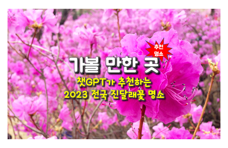 #가볼만한곳 #2023봄꽃개화시기 #2023전국봄꽃개화시기 #2023전국진달래개화시기 #진달래 #봄꽃여행 #전국봄꽃개화시기 #나들이 #연인끼리 #커플여행 #가족여행 #가족나들이 #데이트 #챗GPT #진달래명소 #가볼만한봄꽃여행 #가볼만한진달래명소 #오빠랑가볼만한곳 #오빠랑진달래명소 #오빠랑봄꽃여행 #AI #인공지능