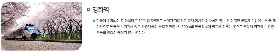 🗺 주요 관광지 : 여좌천 로망스다리 / 경화역공원 / 내수면환경생태공원 / 장복산공원 / 진해루공원 / 제황산공원 등