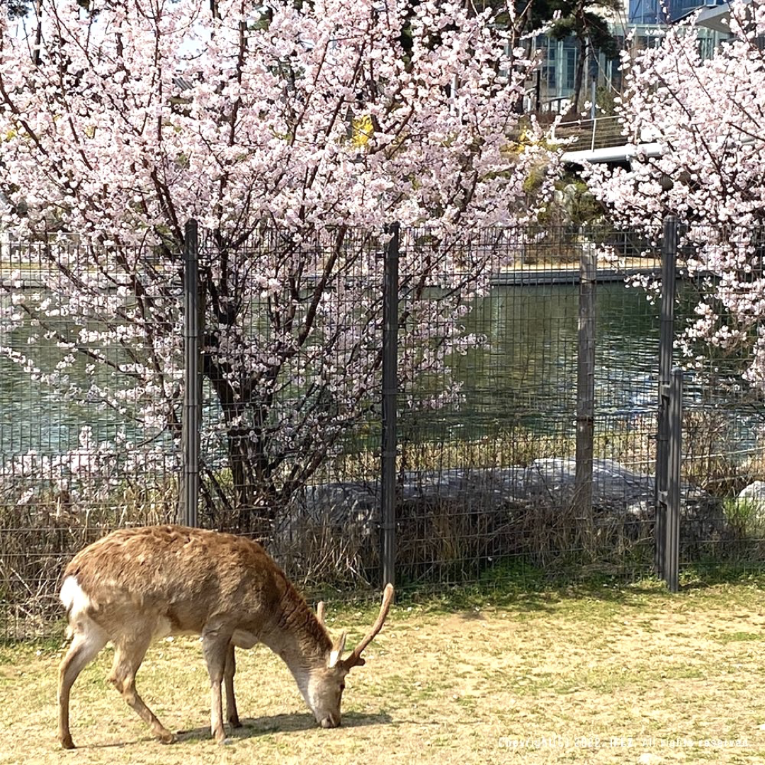 테마정원으로 오면 사슴농장이 있습니다. 이곳에도 사슴과 벚꽃이 한데 어우러져요.
