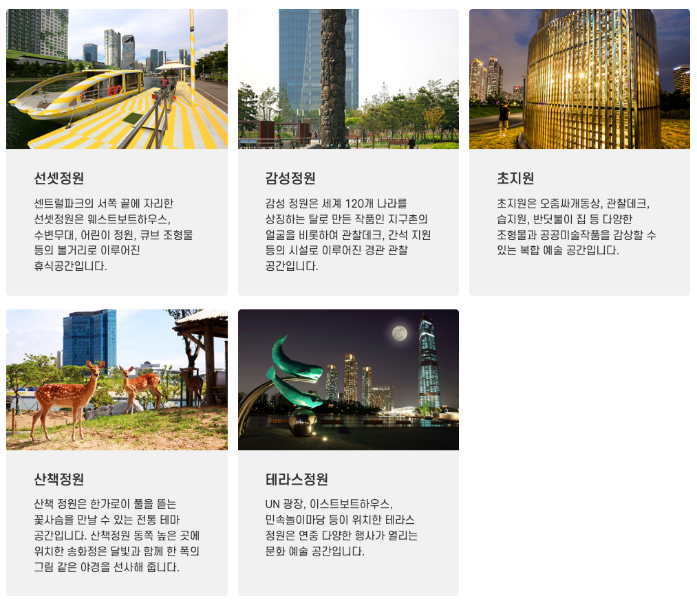 센트럴파크는 어떤 테마들로, 어떤 시설들로 구성되어 있을까요?